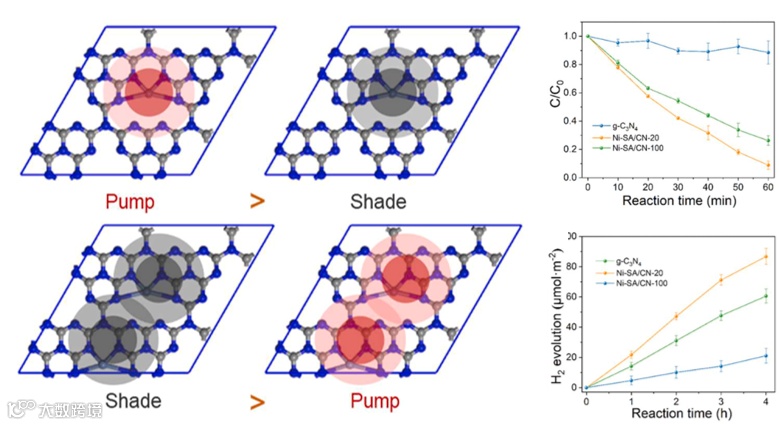 文章同时也揭示了Ni-N4配位对Ni-N4邻接处g-C3N4基底的泵浦效应和屏蔽效应。Ni-N4配位的泵浦效应可以促进氮化碳基底中光生电子空穴的分离和转移,而屏蔽效应将使相邻的氮化碳基质失去半导体性从而抑制高能热载流子的产生。因此优化单原子负载量才可实现最优光催化水分解和污染物降解效果。这项工作研究了单原子催化剂在光催化中的构效关系,并为单原子光催化提供了新的见解。