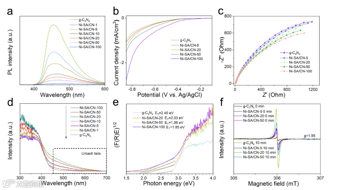 电子顺磁共振(EPR)和光电效应(IT)结果表明,镍单原子的加入有效促进光生电子-空穴对的分离以及转移,从而证实了Ni-N4配位对氮化碳基底中光生电子的泵浦效应。当制备过程中植酸镍添加量超过一定比例(20 mg)后,光诱导产生热电子的数量明显下降。尽管镍单原子负载量提高会提升光的吸收能力,但Ni-N4对毗邻的氮化碳载体单元存在屏蔽效应,影响高能热电荷的产生,从而降低光催化性能。