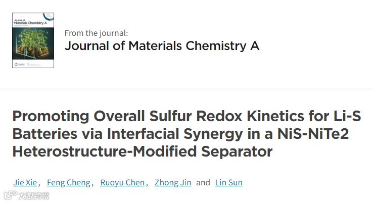 近日,盐城工学院的孙林教授与南京大学的金钟教授合作,在国际材料类知名期刊Journal of Materials Chemistry A上发表题为“Promoting Overall Sulfur Redox Kinetics for Li-S Batteries via Interfacial Synergy in a NiS-NiTe2Heterostructure-Modified Separator”的研究文章。该文设计制备了NiS-NiTe2异质结材料用于锂硫电池PP隔膜修饰层,能够有效抑制多硫化锂的“穿梭”和提升电池的倍率性能。
