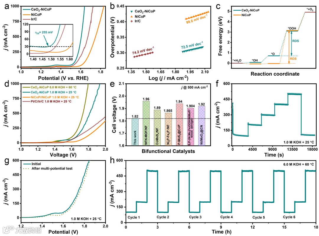 图4. CeO2-NiCoP、NiCoP和商用Pt/C催化剂的(a)OER LSV曲线,(b)相应的Tafel斜率,(c)OER过程的DFT计算结果对比图;(d)CeO2-NiCoP//CeO2-NiCoP、NiCoP//NiCoP和Pt/C//Ir/C在1.0 M KOH和25°C下的全解水LSV曲线,以及CeO2-NiCoP//CeO2-NiCoP在6.0 M KOH和60°C下的全解水LSV曲线对比图;(e)CeO2-NiCoP//CeO2-NiCoP和已报道的双功能电催化剂实现500 mA cm-2的全解水电流所需的驱动电压对比图(1.0 M KOH和25°C);(f)CeO2-NiCoP//CeO2-NiCoP的多电位阶跃计时电流曲线;(g)CeO2-NiCoP//CeO2-NiCoP多电位阶跃测试前后的LSV曲线对比图(1.0 M KOH和25°C);(h)CeO2-NiCoP//CeO2-NiCoP在6.0 M KOH和60°C下的多电位循环阶跃计时电流曲线。