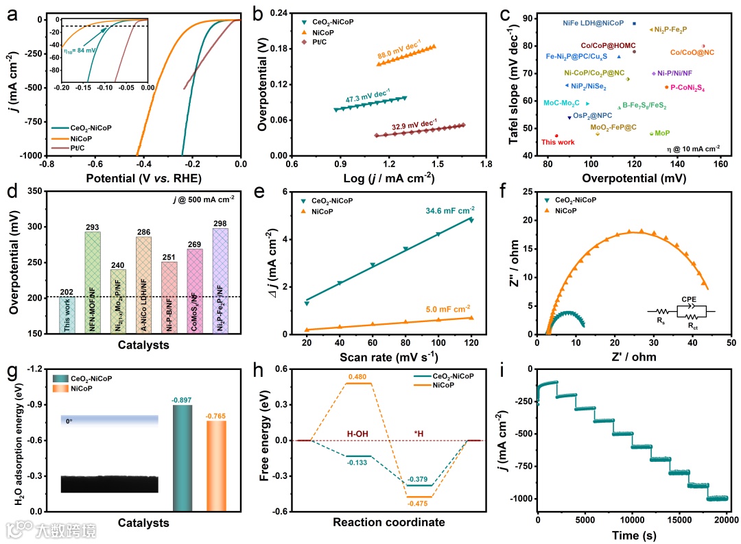 图3. CeO2-NiCoP、NiCoP和商用Pt/C催化剂的(a)HER LSV曲线,(b)相应的Tafel斜率对比图;(c)CeO2-NiCoP的ƞ10和Tafel斜率与目前已报道的HER电催化剂的比较图;(d)CeO2-NiCoP与几种典型的过渡金属电催化剂在500 mA cm-2电流密度下的过电位比较图;CeO2-NiCoP和NiCoP的(e)Cdl值,(f)EIS曲线,(g)水分子吸附能(插图是CeO2-NiCoP的液体接触角),(h)水分子裂解能和ΔGH*对比图;(i)CeO2-NiCoP的多电位阶跃计时电流曲线。