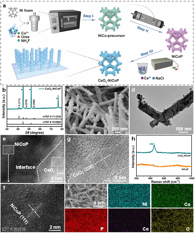 图1.(a)CeO2-NiCoP的合成流程图;CeO2-NiCoP的(b)XRD,(c)SEM,(d)TEM,(e-g)HRTEM,(h)Raman,(i)SEM mapping图。