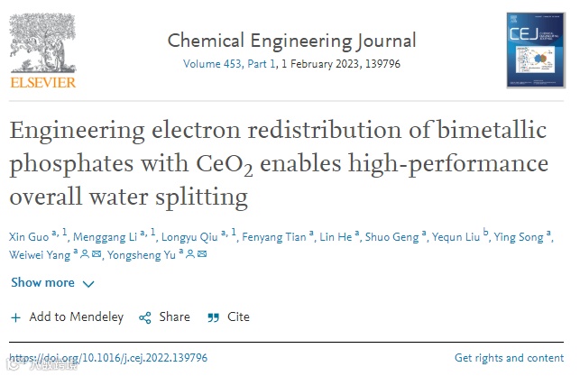Engineering electron redistribution of bimetallic phosphates with CeO2 enables high-performance overall water splitting, Chemical Engineering Journal 453 (2023) 139796.