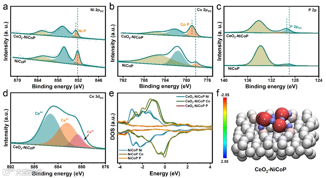 图2. CeO2-NiCoP和NiCoP的(a)Ni 2p3/2,(b)Co 2p3/2,(c)P 2p的XPS对比谱图;(d)CeO2-NiCoP的Ce 3d5/2 XPS谱图;(e)CeO2-NiCoP和NiCoP的DOS对比图;(f)CeO2-NiCoP的Bader电荷分析图。