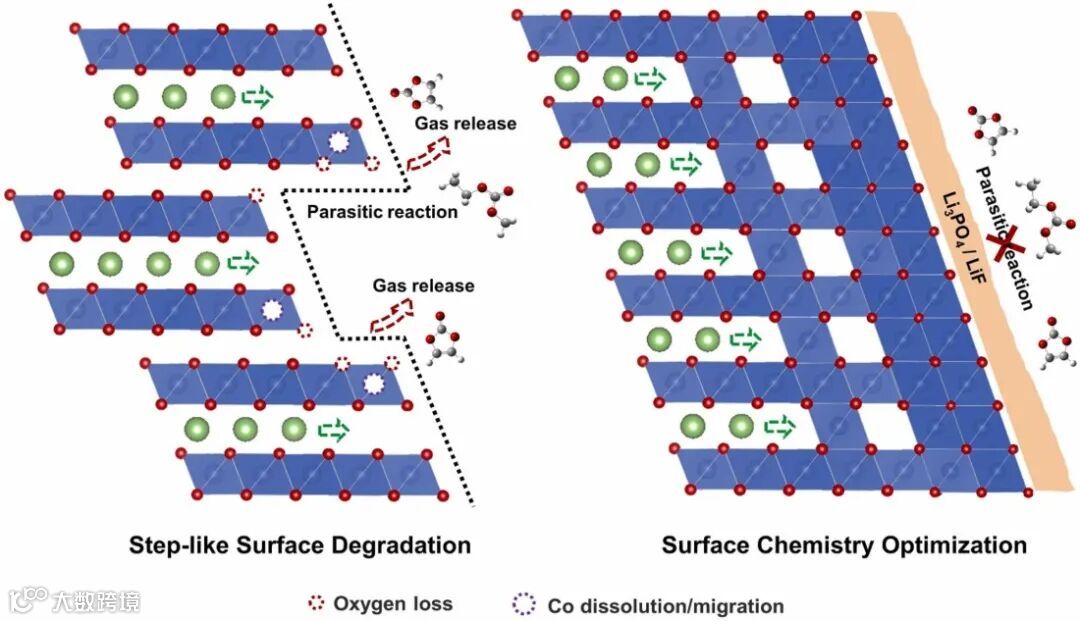 图7. 优化表面化学对减少4.6 V高压LCO的阶梯状结构衰减的示意图