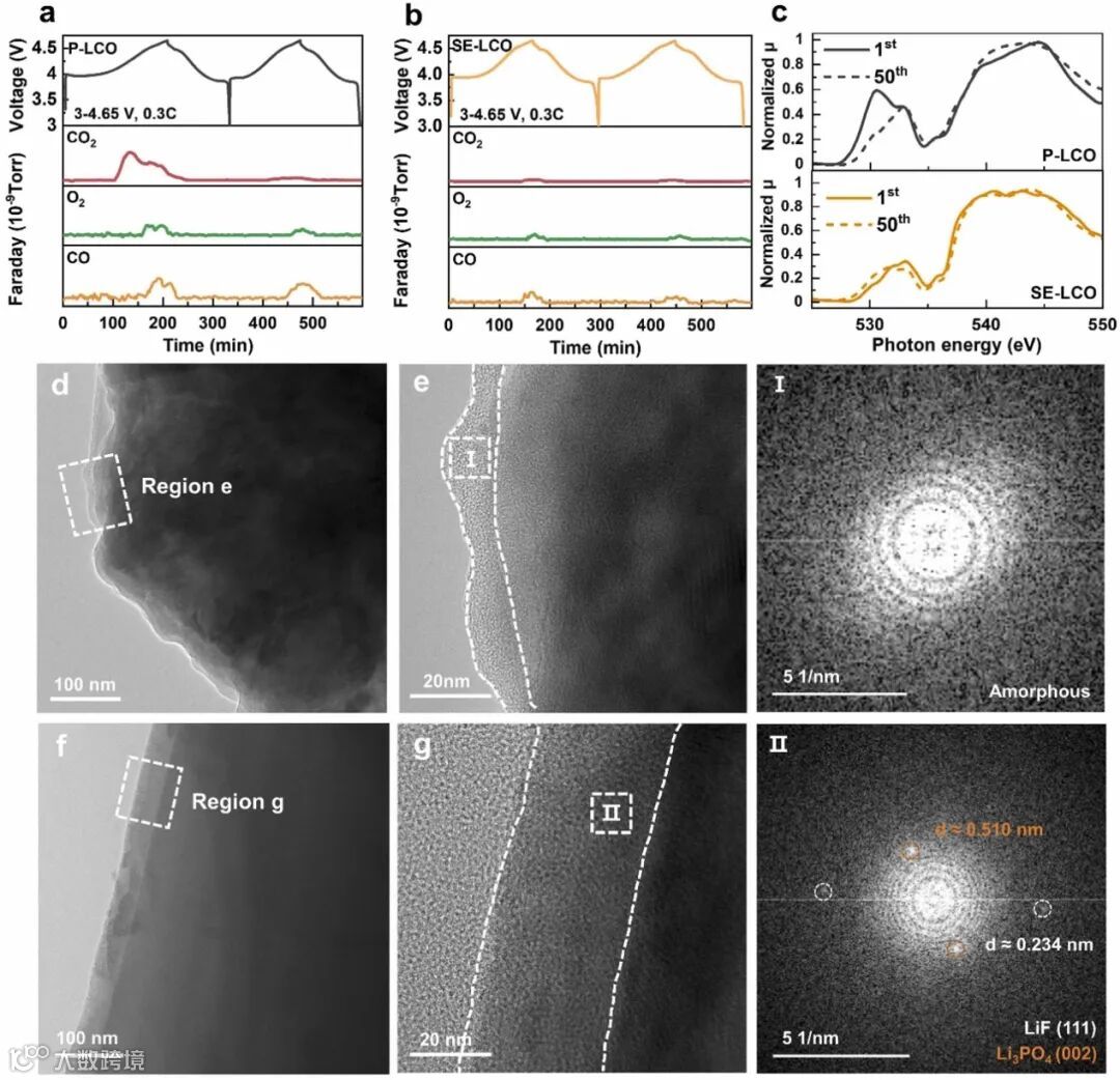 P-LCO阶梯状的表面衰减会诱导产生更多的新鲜表面,从而加剧了晶格氧损失和副反应等问题。而表面化学优化的SE-LCO能够抑制阶梯状表面的出现,并且促进致密、均匀CEI的形成,有效缓解了副反应、晶格氧损失以及钴溶出的问题。