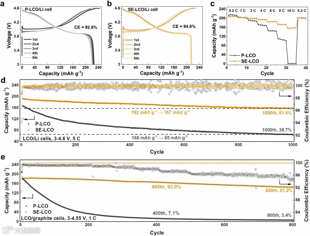 从倍率性能来看,即使在16 C的高倍率下,SE-LCO仍显示出157.6 mAh g-1的高放电比容量。从循环稳定性来看,SE-LCO/Li电池在5 C, 3-4.6 V 条件下,循环1000圈后容量保持率高达81.8%;SE-LCO/graphite 电池在1 C,3-4.55 V条件下,循环800圈后容量保持率达81.2%。上述结果表明,通过优化LCO的表面化学,SE-LCO能够获得优异的循环稳定性和倍率性能。