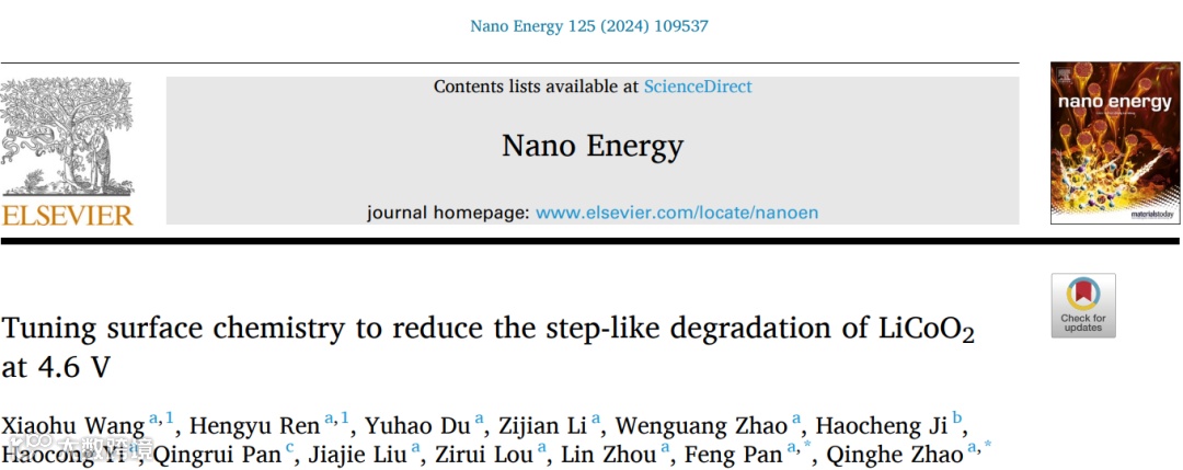 近日,北京大学潘锋/赵庆贺团队揭示了一种LCO高电压下阶梯状表面衰减(step-like degradation,SSD)机制,并利用固态电解质对原始LCO(P-LCO)表面化学进行优化,在LCO(SE-LCO)表面构建出最外层点状Li3PO4、表面岩盐相层和次表面尖晶石相层构成的独特多重结构。得益于这种表面元素及结构优化,SE-LCO不仅表现出增强且更可逆的高压相变,还促进了稳定的正极/电解质界面(CEI)形成,有效缓解了LCO在高电压下阶梯状表面衰减,氧损失和钴溶出的问题。相关成果以题为“Tuning surface chemistry to reduce the step-like degradation of LiCoO2 at 4.6 V”的论文发表在Nano Energy上,王晓虎和任恒宇为本文共同第一作者。