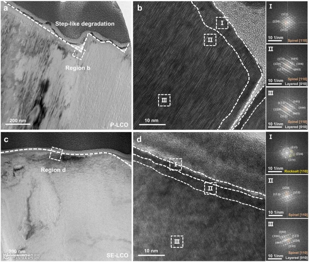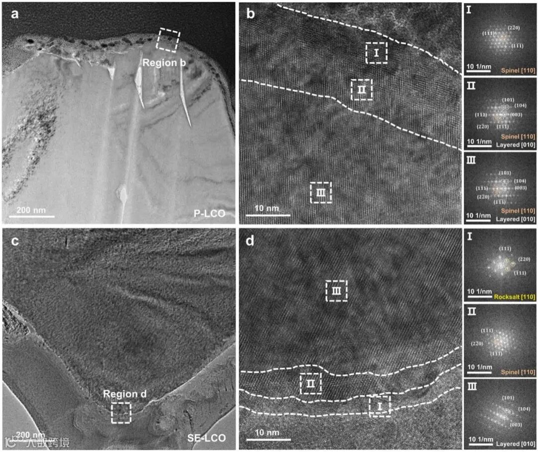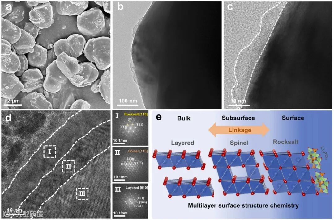 为了对LCO的表面化学进行优化,利用高能球磨将固态电解质(Li1.3Al0.1Ti1.9Si0.2P2.8O12)与LCO混合均匀,并在不同温度下进行退火处理。研究发现,在退火处理的过程中SE-LCO的体相晶格不会产生明显变化。由于固态电解质富含多种外来元素(Al、Si、Ti)和阴离子(PO43-),SE-LCO表面结构发生重构并形成最外层点状Li3PO4、表面岩盐相层以及次表面尖晶石相层构成的独特的多层结构。