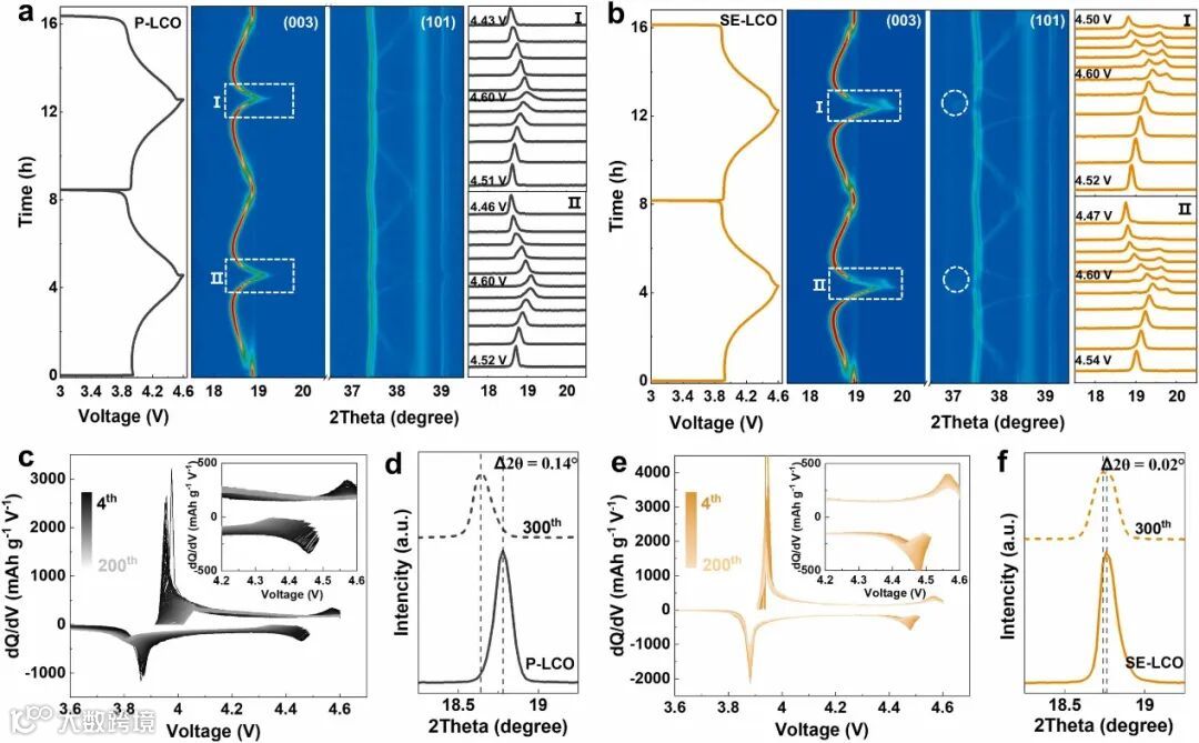 为了阐明SE-LCO循环稳定性和倍率性能改善的原因,我们利用in-situ XRD揭示了P-LCO和SE-LCO的相变过程。当电压低于4.5 V时,P-LCO和SE-LCO经历了类似的相变过程。然而,当电压高于4.5 V时,SE-LCO中H1-3相变的程度高于P-LCO。循环过程中对应的dQ/dV曲线以及循环前后的XRD均表明,SE-LCO具有更强的相变可逆性。总而言之,SE-LCO具有表现出增强且更可逆的高压相变过程。