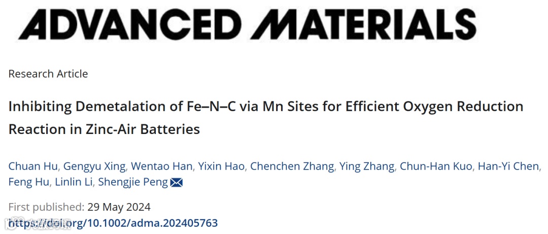 近日,来南京航空航天大学的彭生杰教授,在国际知名期刊Advanced Materials上发表题为“Inhibiting Demetalation of Fe–N–C via Mn Sites for Efficient Oxygen Reduction Reaction in Zinc-Air Batteries”的观点文章。该观点文章探究了通过Mn单原子位点的引入以增强Fe-N-C的稳定性并抑制Fe位点的溶出效应。