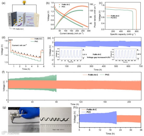 FeMn-N-C催化剂应用于常温液态锌-空气电池表现出151 mW cm−2的功率密度和700小时的循环稳定性,由于大部分报道的单原子Fe基催化剂。在低温(-40°C)固态锌-空气电池中,其充放电循环稳定性超过210小时。此外,由FeMn-N-C组装的纤维柔性电池能够稳定充放电达到36小时。
