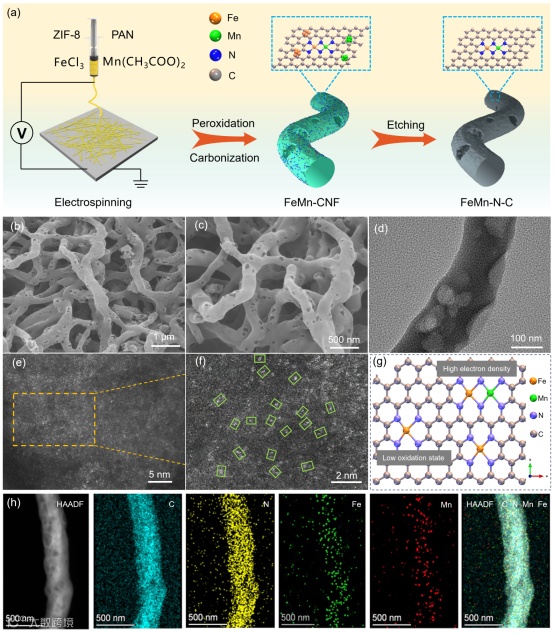 通过静电纺丝结合高温热解和酸刻蚀工艺构建了碳纳米纤维负载的Fe-Mn双金属单原子催化剂。碳纳米纤维有效提升了催化剂在反应过程的结构稳定和耐腐蚀能力。单原子Mn位点能够优化 Fe-N4的电子结构,诱导更多的脱局域电子以降低 Fe 的氧化态。