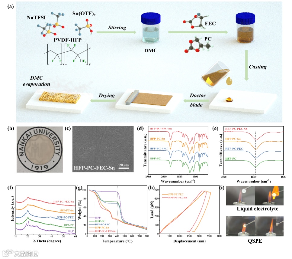 论文首先通过溶液刮涂法制备准固态电解质。以碳酸二甲酯(DMC)代替传统的DMF或者NMP等作为溶剂,并引入适量碳酸丙烯酯(PC)到电解质内部以构建离子传输环境,并添加功能性添加剂氟代碳酸乙烯酯(FEC)和三氟甲磺酸亚锡(Sn(OTf)2)调节离子传输以及界面相容性和稳定性。所制备的准固态电解质具有优异的力学性能(Young’s modulus: 79 MPa)以及阻燃性。
