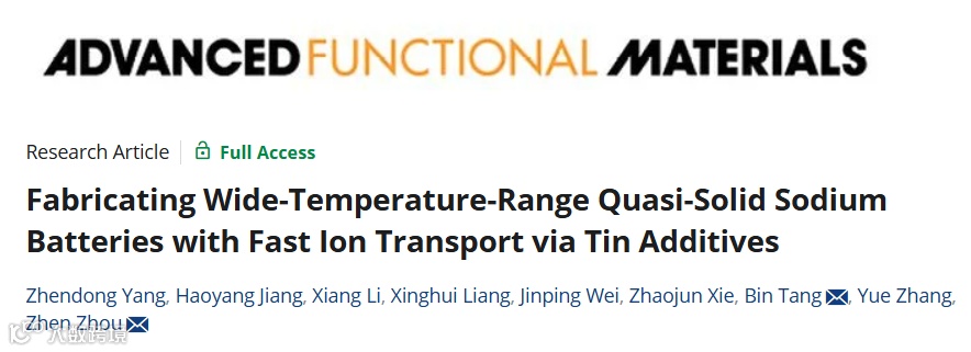近日,郑州大学唐宾副研究员、周震教授和南开大学团队合作,在国际知名期刊Advanced Functional Materials上发表题为“Fabricating Wide-Temperature-Range Quasi-Solid Sodium Batteries with Fast Ion Transport via Tin Additives”的研究性论文。该工作设计了一种能够在-20℃到60℃宽温域内稳定运行的准固态电解质。通过在PVDF-HFP基准固态电解质中引入功能化添加剂三氟甲磺酸亚锡(Sn(OTf)2),诱导基体中的碳酸丙烯酯(PC)的开环反应,实现电解质内部以及电解质/电极界面的快速钠离子传输。Sn(OTf)2和FEC实现富含金属Sn和NaF的界面层形成,有效调节界面处的钠离子沉积和剥离,从而抑制钠枝晶的生长。得益于准固态电解质内部及界面处快速的离子传输,准固态钠全电池能够在–20℃到60℃的宽温度范围内稳定循环。