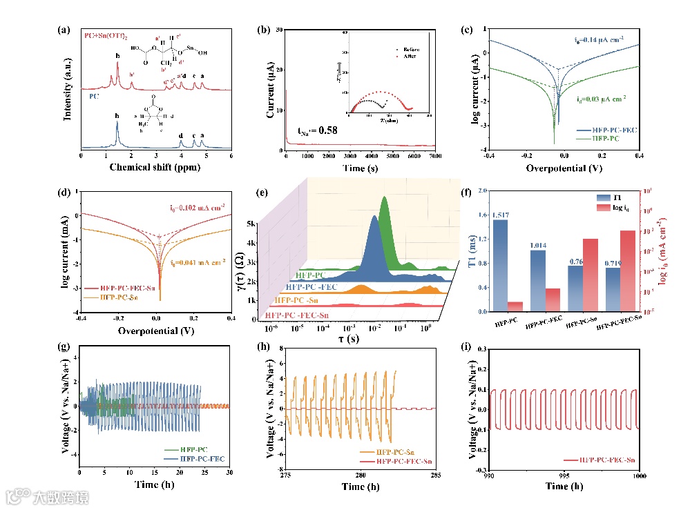 为了探究准固态电解质内部离子传输机理,作者对准固态电解质进行了进一步表征。核磁结果证明,Sn(OTf)2的加入,能够催化PC的开环反应,从而能够极大降低电解质内部离子传输障碍,提高传输动力学。交换电流测试证明Sn(OTf)2也能够提高界面处的离子传输,从而实现快速且均匀的钠离子沉积剥离。弛豫时间分布也证明该准固态电解质优异的离子传输动力学。对对称电池循环后的钠负极表面进行表征,证明Sn(OTf)2和FEC的引入,形成了富含NaF和金属Sn的致密且平整界面,有利于提高循环稳定性。