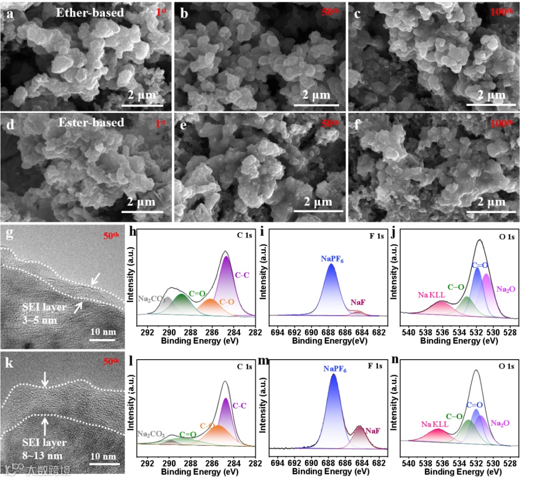 图3 材料在醚基和酯基电解质SEI膜的原位生成以及组分分析