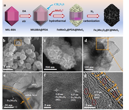 以聚多巴胺(PDA)/Fe-MOF为自牺牲模板,一步法水热将二维MoS2纳米片垂直生长在纳米颗粒表面,得到三明治结构FeMoO4@PDA@MoS2复合材料。由于多巴胺(DA)中游离的酚羟基易于吸附离子,水热过程中游离的DA分子成功插入MoS2层板之间,导致层间间距的扩大和扭曲。N2气氛下,通过高温碳化相转变,制备了具有局部扩展层间间距的限制结构Fe2Mo3O8@C@MoS2。