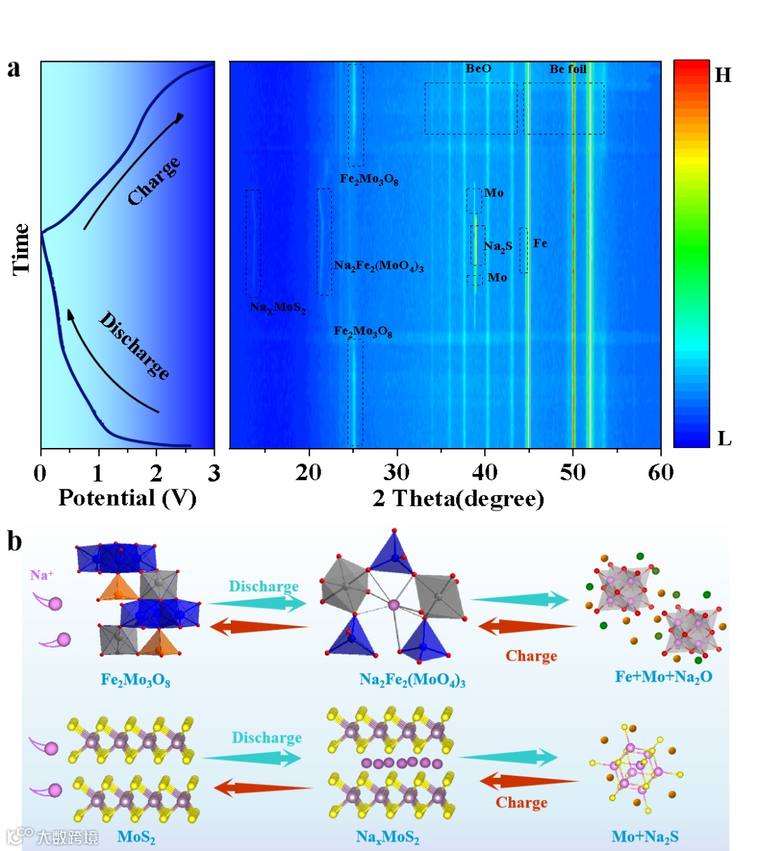 锂离子电池作为一种典型的储能技术,在动力电池领域有着深远的影响。然而,锂资源的快速消耗使其面临的严峻的挑战。相比之下,钠具有成本低、储量丰富以及与锂有许多相似性质的优点,被认为是最理想的锂替代品之一。遗憾的是,Na+的离子半径比Li+大,使得Na+在石墨中的嵌入/脱出更加复杂。因此,迫切需要开发更合适的钠离子电池负极材料。作为铁基混合金属氧化物,Fe2Mo3O8具有经济、环保和金属元素价态丰富的优势。在这种材料中,铁和钼元素呈现各种氧化态,包括Fe(II)、Fe(III)、Mo(IV)和Mo(VI),提供了丰富的电子结构和多样的化学反应性。
