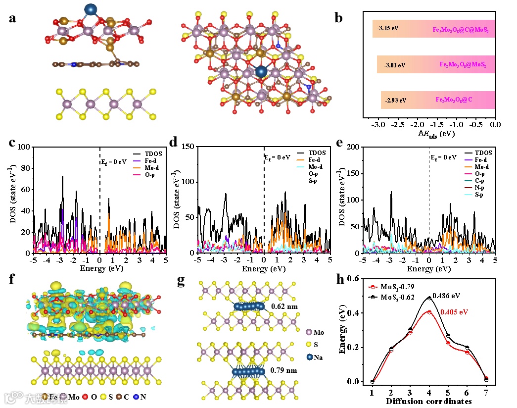 DFT计算表明,相对于Fe2Mo3O8@MoS2和Fe2Mo3O8,三明治结构的Fe2Mo3O8@C@MoS2具有更优的Na+吸附能力。此外,从差分电荷密度来看,Fe2Mo3O8和C之间存在明显的电荷积累/耗尽,表明界面较强的相互作用。bader电荷计算结果表明,碳层向Fe2Mo3O8侧转移了0.89 e−,使O原子周围的形成负电荷中心,为Na +的吸附提供了有利的环境。态密度(DOS)表明Fe2Mo3O8和Fe2Mo3O8@MoS2显示出半导体特性。相比之下,由于碳夹层的贡献,Fe2Mo3O8@C@MoS2在费米能级上的电子密度显著增加,表现出导体性质。通过对三种模型上Na+扩散能垒计算,在Fe2Mo3O8@C@MoS2模型上,Na+的扩散能垒为0.263 eV,远低于Fe2Mo3O8@MoS2的0.322 eV和Fe2Mo3O8的0.371 eV。除此之外,我们进一步计算了Na+在不同层间距MoS2中的扩散能垒,以说明层间距对性能的影响。
