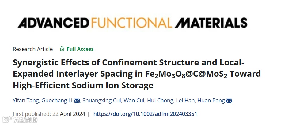 近日,宁波大学李国昌与扬州大学庞欢教授合作,在国际知名期刊Advanced Functional Materials上发表题为“synergistic effects of confinement structure and local-expanded interlayer spacing on Fe2Mo3O8@C@MoS2towards high-efficient sodium ion storage”的研究型文章。