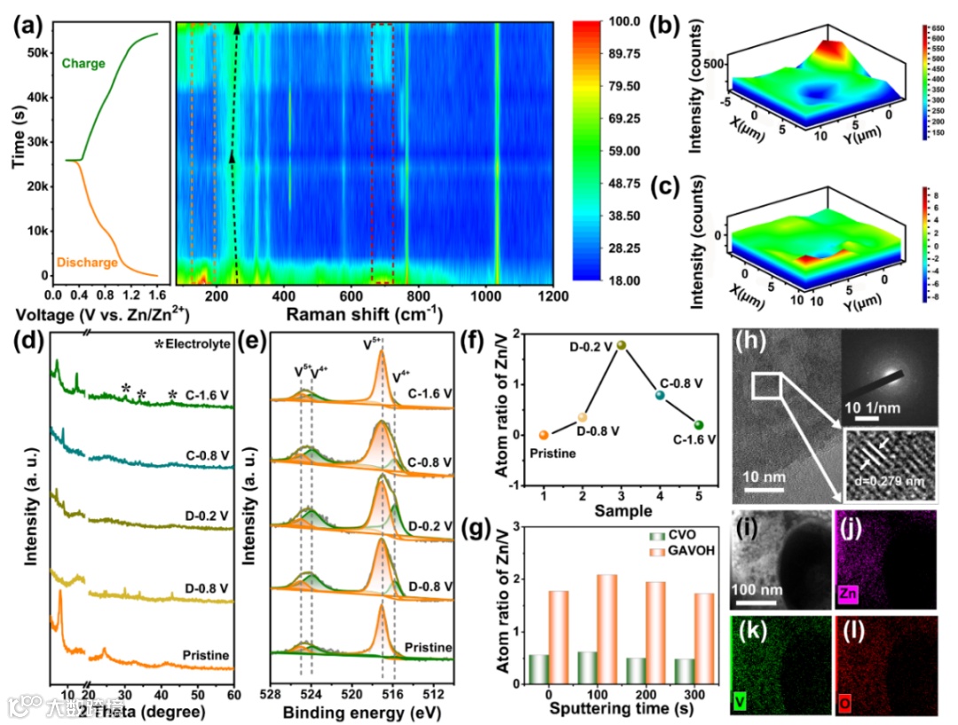 图4. GAVOH充放电过程表征. (a) GAVOH充放电过程中的原位拉曼和拉曼mapping研究(b,c);GAVOH充放电过程中对应的XRD表征(d)和XPS表征(e);(f) GAVOH充放电过程中Zn/V原子比的变化;(g) 完全放电的GAVOH和CVO的Zn/V原子比随XPS溅射刻蚀时间变化;(h) GAVOH放电后透射图及其对应的电子衍射图;(i-l) GAVOH放电后的HAADF-TEM图及元素mapping。