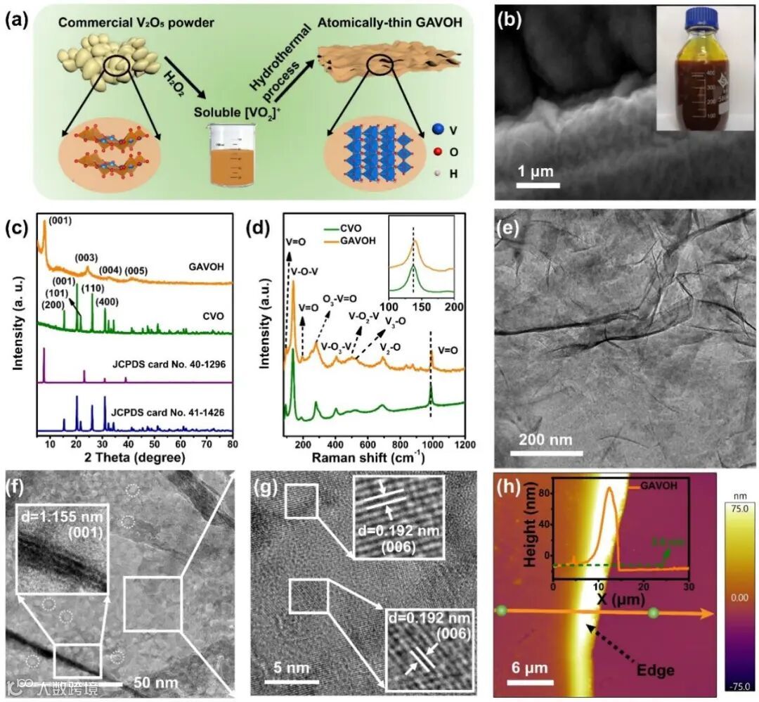 图2. 类石墨烯氧化钒(GAVOH)的制备和表征. (a) GAVOH的制备示意图;(b) GAVOH负载在碳布上的SEM图,插图显示500 mL GAVOH凝胶;(c) GAVOH和商用氧化钒(CVO)的XRD和拉曼图(d);GAVOH的透射图(e)和高分辨透射图(f,g);(h)GAVOH的AFM图。