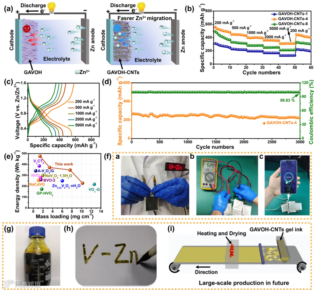 图6. 碳管支撑优化的类石墨烯氧化钒性能测试. (a) GAVOH-CNTs对锌离子迁移优化示意图;(b) GAVOH-CNTs不同碳纳米管添加量的倍率性能图;(c) GAVOH-CNTs-4不同电流密度下的充放电曲线;(d) GAVOH-CNTs-4在5000 mA g-1电流密度下的循环性能测试;(e) 该工作和其他报道工作的载量和能量密度对比图;(f) 全电池器件演示;(g) 500 mL复合材料凝胶液体;(h) 用毛笔书写的V-Zn字样;(i) 未来电极工业化生产流程图。