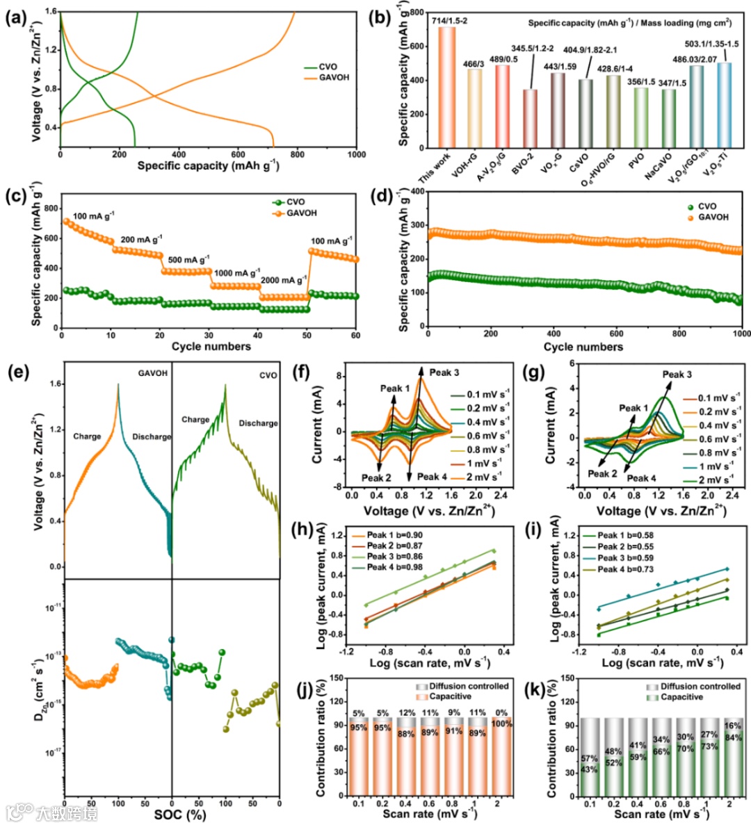 通过电化学测试表明GAVOH容量远高于商用氧化钒(CVO),最高容量可达714 mAh g-1,优于其他目前所报道的钒类材料,如图3所示。GITT测试表明GAVOH的锌离子扩散动力高于CVO,而通过CV曲线计算的“b”值和电容占比显示GAVOH的容量贡献主要来源于电容贡献。