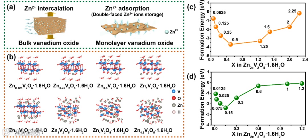 图1. 单层和多层氧化钒储锌的理论研究. (a) 单层和多层氧化钒的锌离子储存机制演示;(b) 嵌入不同量锌离子的氧化钒构型;(c)单层氧化钒嵌锌的形成能变化;(d) 五层氧化钒(代表块体材料)嵌锌的形成能变化。