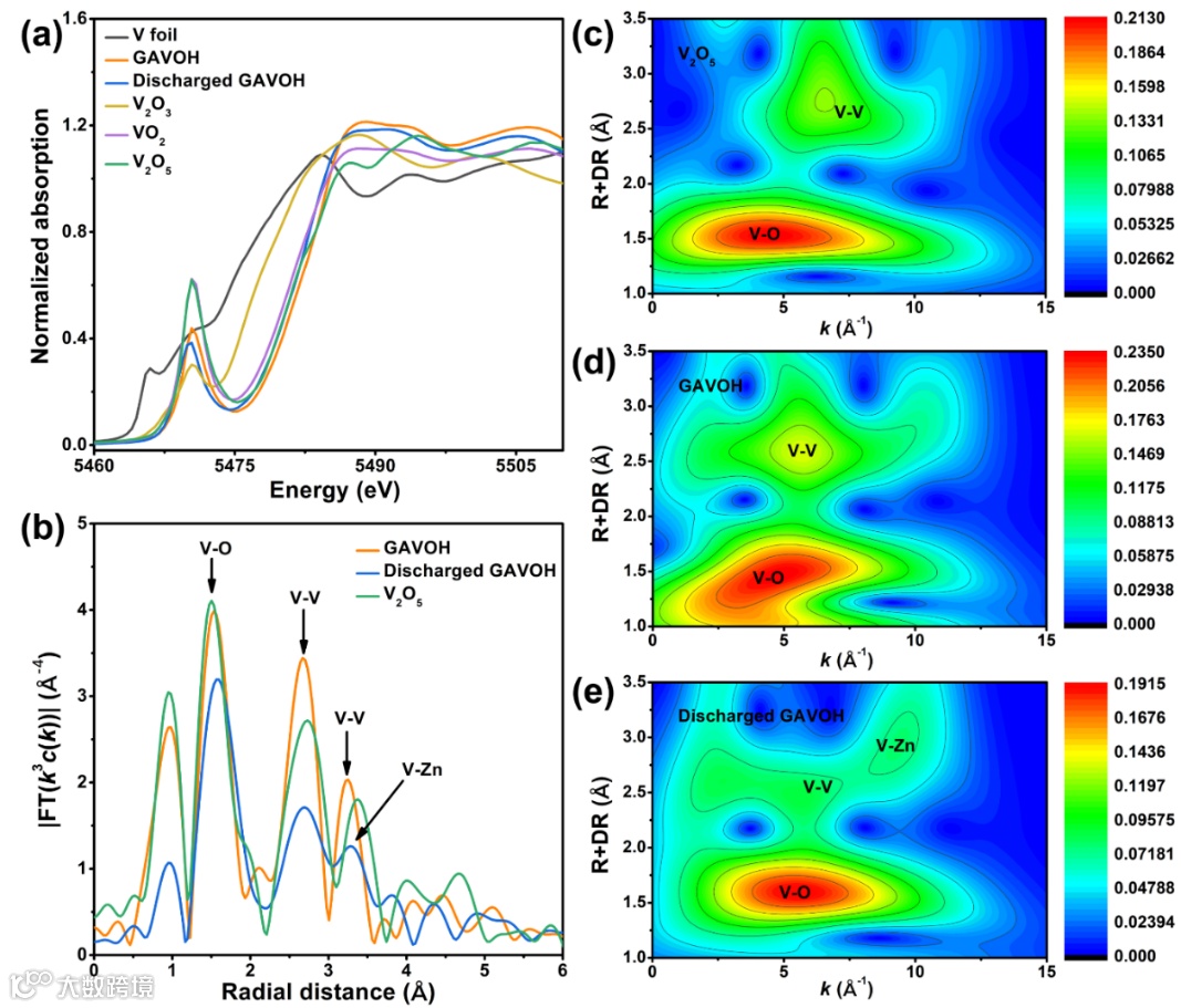图5. 同步辐射表征. (a,b) V2O5,GAVOH和放电的GAVOH以及对比样的同步辐射吸收谱近边结构(XANES)和拓展边结构(EXAFS);(c-e) V2O5,GAVOH和放电的GAVOH小波变换图。