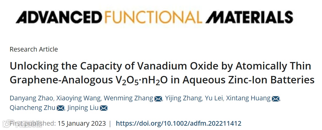 基于此,河北大学校聘教授朱前程博士、张文明教授,华中师范大学黄新堂教授联合武汉理工大学刘金平教授在Advanced Functional Materials期刊上发表了题为“Unlocking the Capacity of Vanadium Oxide by Atomically Thin Graphene-Analogous V2O5·nH2O in Aqueous Zinc-Ion Batteries”的研究论文。
