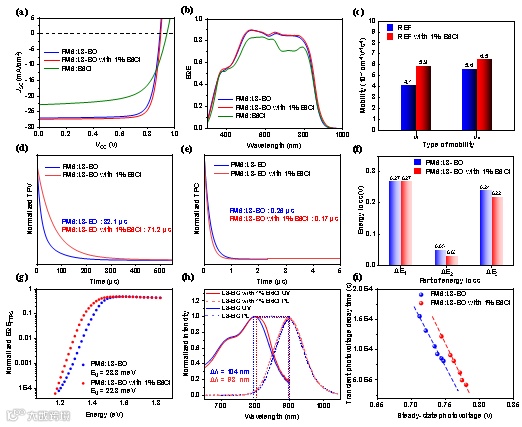 如图4所示,压缩分子堆积策略下非富勒烯分子织构的转变不仅通过更紧密的π-π层叠结构使得光伏电池的载流子传输和提取效率大幅提升,而且通过更有序的烷基侧链堆积有效抑制了光伏电池工作过程中的非辐射能量损失,进而实现了光伏电池JSC、FF和VOC的同时提升。
