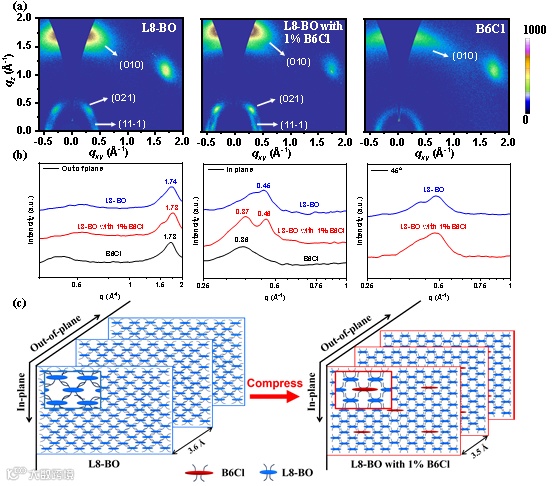 在本工作中,作者设计合成了具有大孔隙的π-扩展非富勒烯受体B6Cl(图2)并将微量的B6Cl引入到同样具备网状堆积结构但孔隙较小的L8-BO中去研究了受体分子堆积行为的变化。尽管在L8-BO和B6Cl各自的纯受体膜中难以观察到晶格条纹,但在L8-BO 和 微量B6Cl的共混膜中却可以观察到明显的晶格条纹。这表明,B6Cl能够显著促进宿主受体的结晶过程,从而提高分子堆积的有序度(图2)。GIWAXS测试和分子动力学模拟表明,B6Cl的引入不仅可以显著缩短宿主受体分子π-π堆积的距离,而且在面内方向显著提高了烷基链排列的有序性,使得宿主L8-BO分子堆积结构被压缩且变得更为有序,从而在提升载流子传输的同时抑制非辐射复合(图3)。