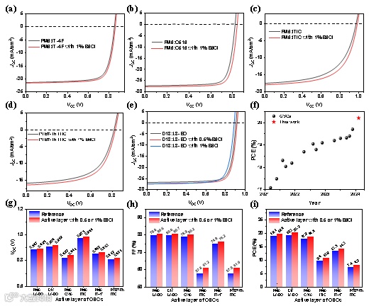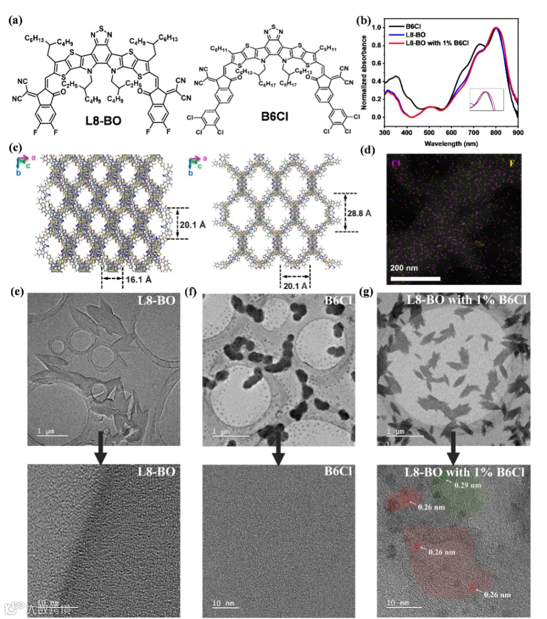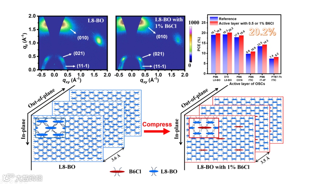 此外,利用该策略将B6Cl微量引入使其兼容于多种聚合物:非富勒烯体系(图5),该工作最终在D18:L8-BO体系中实现了目前单节有机太阳能电池中最高的PCE(20.2%)。