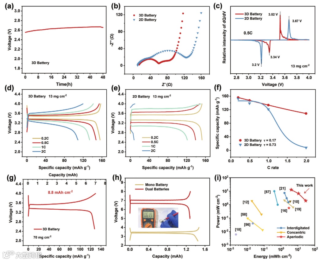 图5. 3D电池的电化学性能。(a) 3D电池OCV曲线。当LFP载量≈13 mg cm−2时,(b) Nyquist图,(c) 3D和2D电池的dQ/dV曲线比较。(d) 3D电池和 (e) 2D电池的倍率性能。f) 3D电池与2D电池利用公式2的比容量-倍率图的比较 (g) LFP载量为70 mg cm−2的3D电池在0.05C时的电压-容量曲线。(h) 1 ~ 2节串联的3D电池在0.2时的电压曲线。(i) 文献报道的3D电池,并与本文报道的结果进行比较。