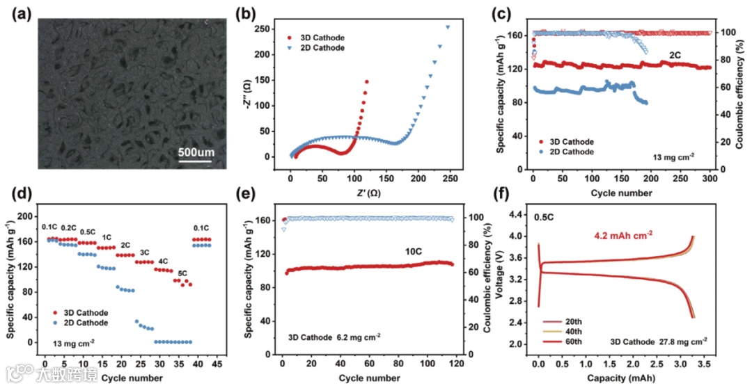 图2. 3D正极的形貌及3D正极半电池的电化学性能。(a) 3D正极的光学显微镜图像。(b) 3D和2D正极的Nyquist图。3D和2D正极的 (b) 循环性能和 (d) 倍率性能,正极质量负载为LFP≈13 mg cm−2。(e) LFP 载量为6.2 mg cm−2的3D正极在10C下的循环性能 (f) LFP载量为27.8 mg cm−2在0.5C下的电压分布图。