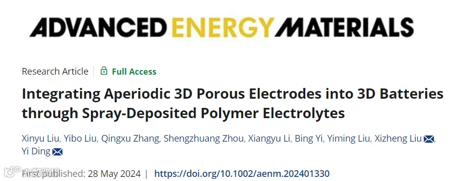随着电动汽车和3C电子产品的广泛普及,尤其是微型机器人、芯片和物联网(IoT)领域的快速发展,迫切需要体积更小能量密度更高的锂离子电池。提高电极中活性物质载量,制作厚电极是提升微小型电池能量密度的重要途径,但传统的二维电池受限于厚电极中缓慢地电荷转移动力学,体积能量密度和功率密度方面已接近其理论极限。得益于正负极活性材料之间的大比表面积接触和有效缩短电子、离子传输距离等方面的优势,三维(3D)电池有望在未来微型高比能储能器件领域发挥重要作用。然而,在一体化三维电池集成方面,如何在三维异构界面构建完整而均匀的电解质/隔膜有效分隔正负极,同时确保高效的离子传输仍然是一个重大挑战。
