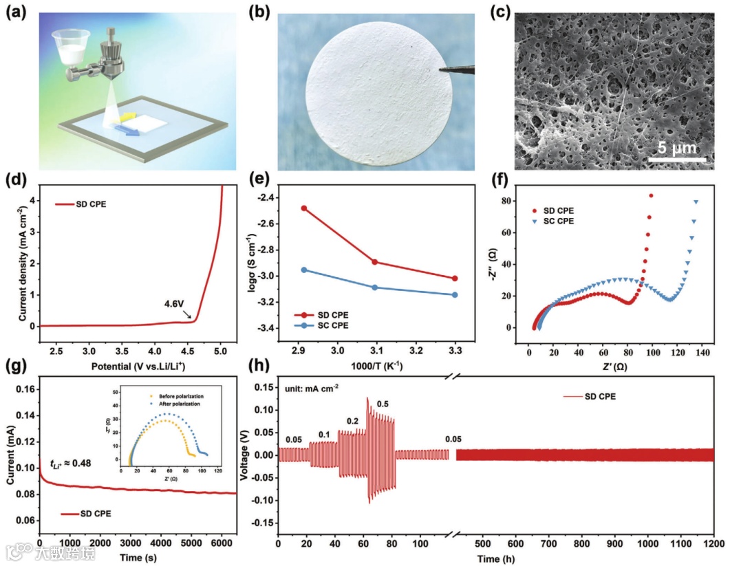 图3. 复合聚合物电解质 (CPEs) 的制备与表征。(a) 喷雾沉积法制备CPEs的方案。(b) CPE膜的数码照片。CPE的 (c) SEM图像,(d) LSV曲线(扫描速率为10 mV s−1)。(e) CPEs在30 ~ 70℃不同温度下的离子电导率。(f) 不同CPEs的Nyquist图。(g) CPE极化前后电池的极化曲线和阻抗图(插图)。(h) 不同电流密度下CPE锂对称电池循环的电压分布图。