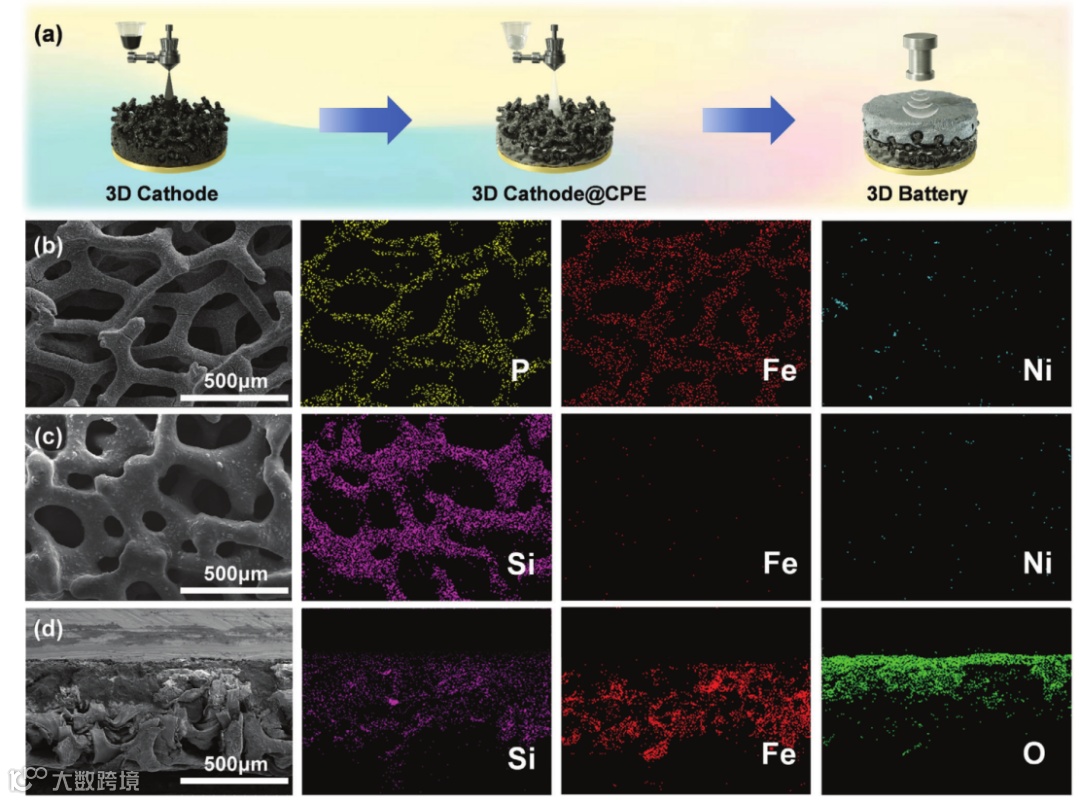 图4. 3D电池的制备与表征。SEM图像和EDS映射 (a) 3D电池制备过程示意图。(b) 3D正极,(c) 3D 正极@CPE, (d) 一体化非周期性3D电池横截面