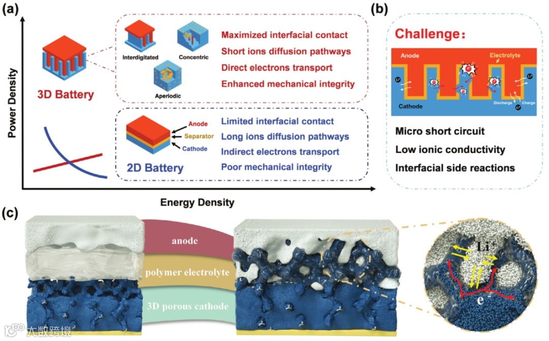 图1. 3D电池的优势与挑战。(a) 3D和2D电池对比。(b) 构建3D电池的挑战。