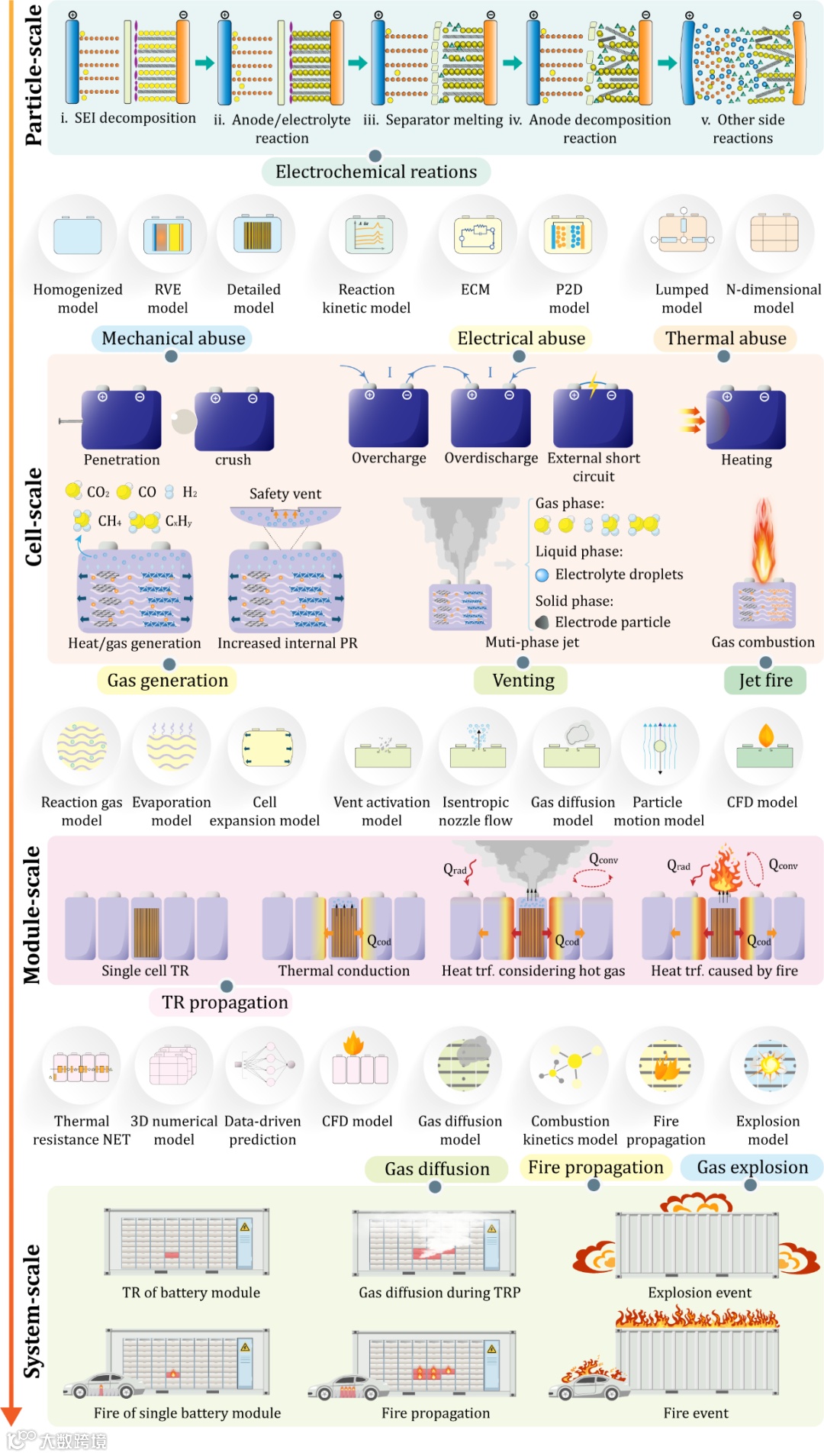 图1. 不同尺度下锂离子电池热失控作用机制、演化特征与其过程中所涉及的建模技术。