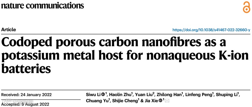 Codoped Porous Carbon Nanofibres as A Potassium Metal Host for Nonaqueous K-ion batteries (Nat. Commun. 2022 DOI:10.1038/s41467-022-32660-y)