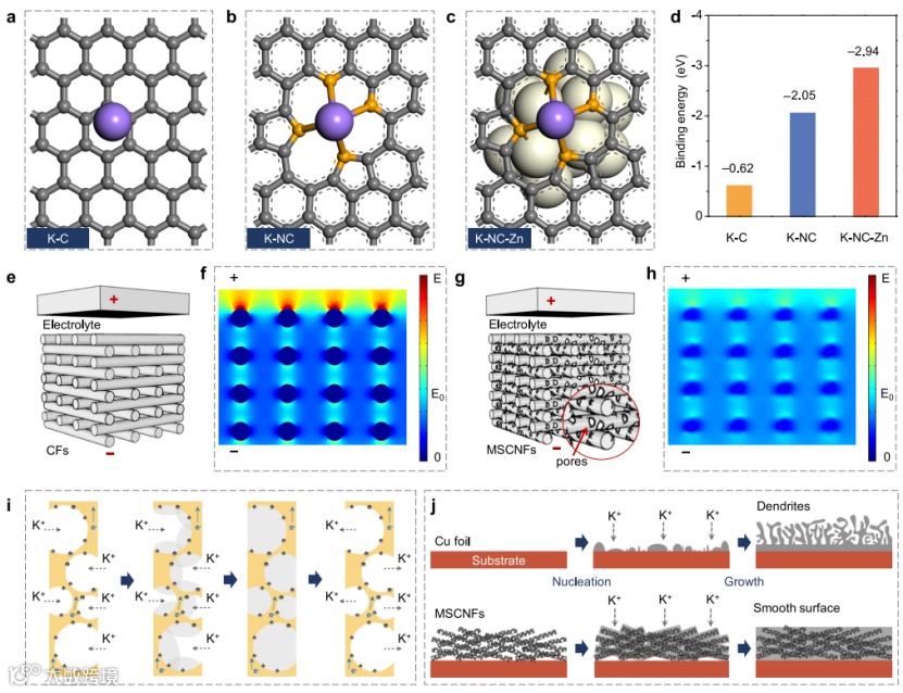 图4 (a)DFT计算的K原子和不同基体的结合能及(b-d)对应模型。(e-f)CFs和(g-h)MSCNFs的模拟建模,及对应的电势长分布图;MSCNFs上的(i)K沉积和剥离以及不同基体上的(j)K+沉积原理图。