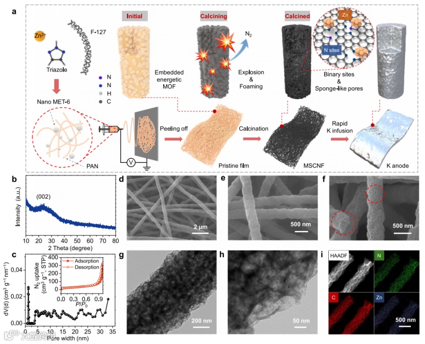图1 (a)MSCNFs的合成路线和相应的K复合负极;(b)MSCNFs的PXRD谱图;(c)MSCNFs的孔径分布及N2吸附脱附;(d-f)MSCNFs的SEM图. MSCNFs的(g)TEM和(h)HRTEM图;(i)HAADF模式下MSCNFs的EDS元素分布。