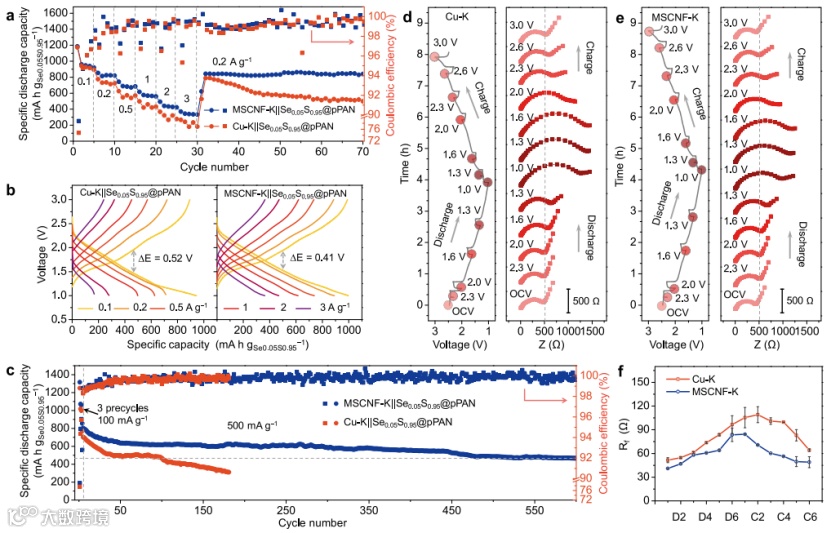 图6 (a)Cu-K和MSCNF-K负极的倍率性能;(b)Cu-K和MSCN-K负极的充放电曲线;(c)长循环稳定性测试;(d)Cu-K||Se0.05S0.95@pPAN和MSCNF-K||Se0.05S0.95@pPAN的原位电化学阻抗;(f)不同荷电状态下阻抗的Rf的值。