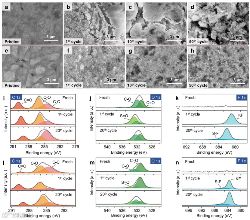 图5 在不同循环次数后,对称电池中(a-d)K和(e-h)MSCNF-K负极的非原位SEM图;在不同循环后,对称电池中Cu-K负极的非原位XPS图:(i)C 1s,(j)O 1s以及(k)F 1s;不同循环后,对称电池中MSCNF-k负极在的非原位XPS图:(l)C 1s, (m) O 1s以及(n) F 1s。