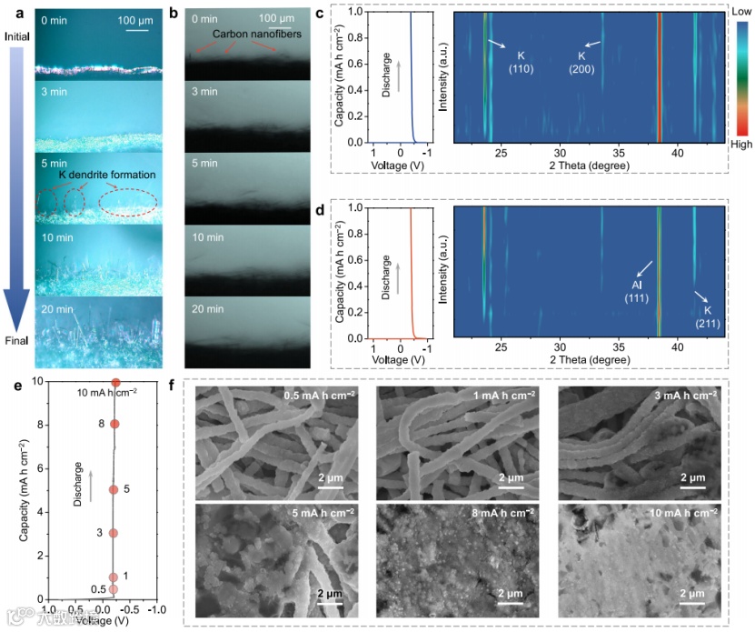 图3 在6 mA/cm2电流密度下,在(a)Cu和(b)MSCNFs上沉积K的原位光学显微图;在5 mA/cm2电流密度下,在(c)铝箔和(d)MSCNFs上沉积K的XRD对比谱图;(e)电流密度为0.5 mA/cm2时,MSCNFs表面K沉积的电压分布图和对应的(f)不同放电状态下MSCNFs的SEM图。