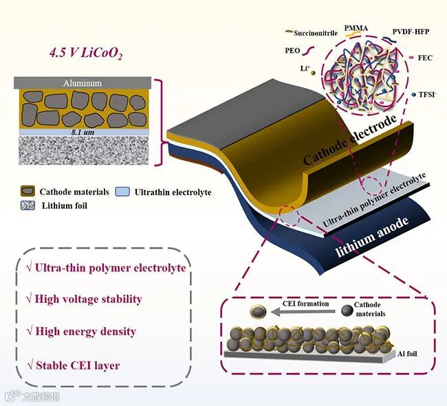 一种超薄的半固态聚合物电解质及其在4.5V的LiCoO2半固态电池的应用。