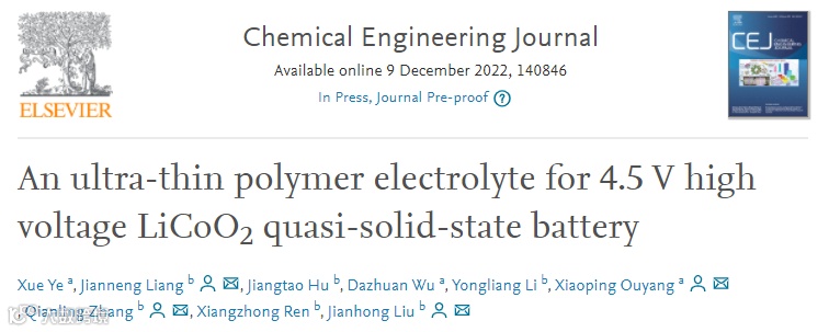 鉴于此,浙江大学欧阳晓平院士和深圳大学刘剑洪教授、张黔玲教授和梁健能研究员等人深入研究了PEO基超薄固态电解质的制备,在《Chemical Engineering Journal》上面发表了An ultra-thin polymer electrolyte for 4.5 V high voltage LiCoO2 quasi-solid-state battery的论文,浙江大学能源工程学院博士生研究生叶雪为论文第一作者。